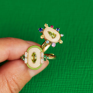 Hand-carved fossilised mammoth is set with a marquise peridot, surrounded by green enamel and decorated with diamond baguettes and round tsavorites. The ring is created in 18k yellow gold.