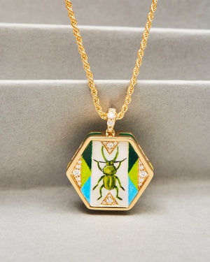 A lucky beetle visits our picnic scene. Flip the pendant to reveal a vintage cameo depicting a brave warrior. The gold band is decorated with enamel and diamonds.