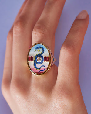 A snake transforms our picnic scene, enriched with diamonds and rhodolite baguettes. Flip the disc of the ring to reveal a vintage cameo depicting a beautiful nymph and her companion, a fawn. The gold band is decorated with enamel and diamonds.