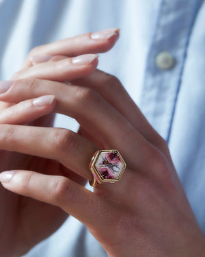 Change Your Stripes is a collection of reversible rings and pendants. Flip the disc to reveal a vintage resin cameo or a joyful miniature painting.
