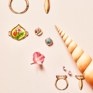 The Cherry Flower Ring features a masterfully hand-carved and painted cherry blossom. The crystal is backed with mother of pearl, and is placed in a bezel setting, set with pink sapphires. The locket ring opens to reveal a hand painted image of the sea created in enamel. The ring is created in 18k pink gold.