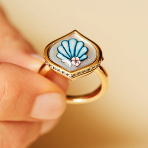 The Shell Sea Ring features a masterfully hand-carved and painted seashell. The crystal is backed with mother of pearl, and is placed in a bezel setting, set with blue sapphires. The locket ring opens to reveal a hand painted image of the sea created in enamel. The ring is created in 18k pink gold.