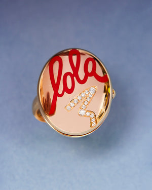 The Lola Ring opens to reveal a crystal depicting a cheeky naked pin up playing golf, set within a line of red enamel. On the front of this locket ring her name - Lola - is enamelled in red and set with diamonds.The ring is created in 18k rose gold.