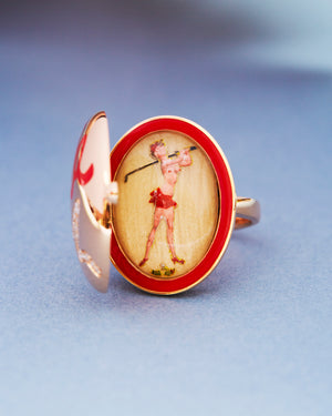The Duck Ring pictures an elegant duck in mid flight. The crystal is backed with a gold plate and is surrounded by orange enamel set with yellow sapphires. The ring is created in 18k yellow gold.