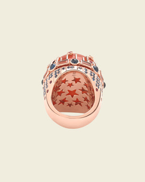 Descending from the dome are structural lines of blue sapphires finished with a ruby. Stars are imprinted into the inside of the band, a secret reminder to the wearer to