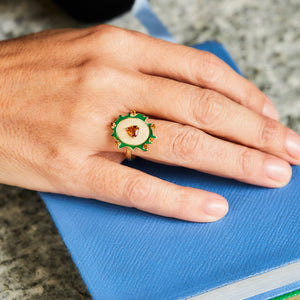 Hand-carved fossilised mammoth is set with a heart shaped citrine, surrounded by green enamel flames and set with round citrines. The ring is created in 18k yellow gold.