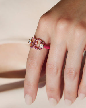 Two interlocking love hearts are created in 18k pink gold set with rhodolite pavé and pear-shaped diamonds. The band of the ring is decorated in a deep pink enamel.