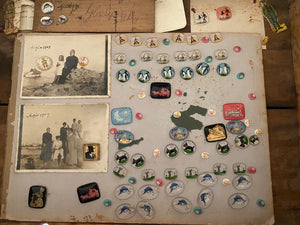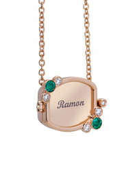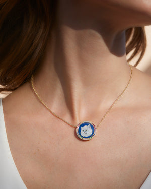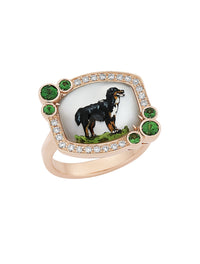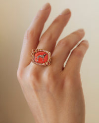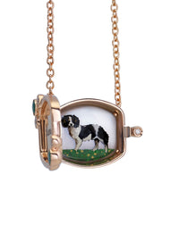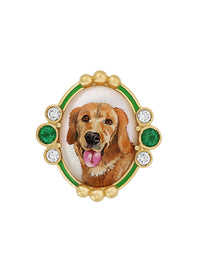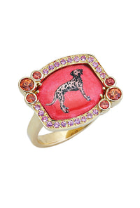 18k Yellow gold, Pink Sapphires (0.18ct), Orange Sapphires (0.39ct), Hand carved and painted intaglio Rock Crystal